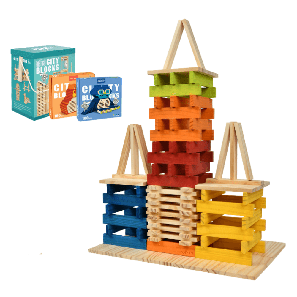 Elegantní sada 100 dřevěných stavebních kostek v chladných pastelových odstínech – pevné, hladké a bezpečné dílky pro nekonečnou kreativní hru. Kombinují se s ostatními sadami MiDeer a podporují představivost dětí od 3 let.