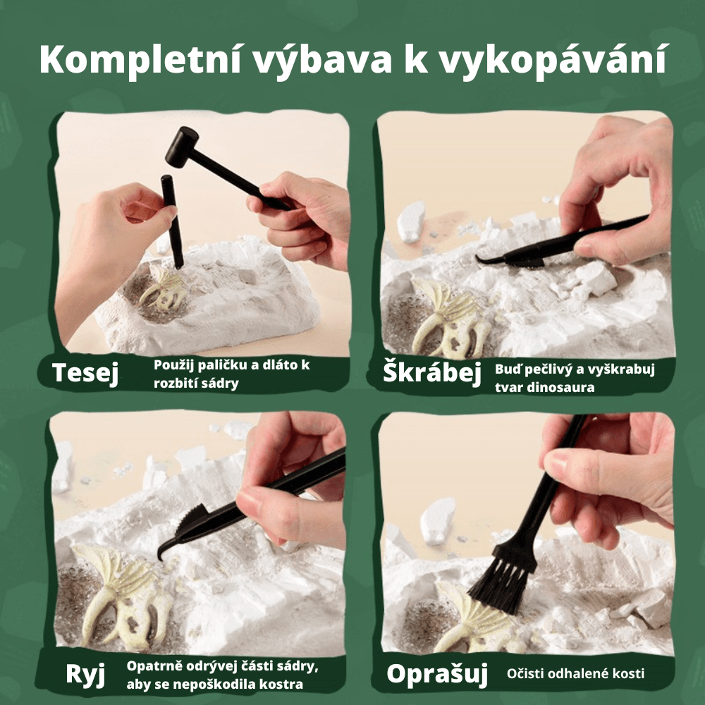 - 3 výkopové nástroje, které umožní jemné “vykopávání” kostry Triceratopse z odlitku.