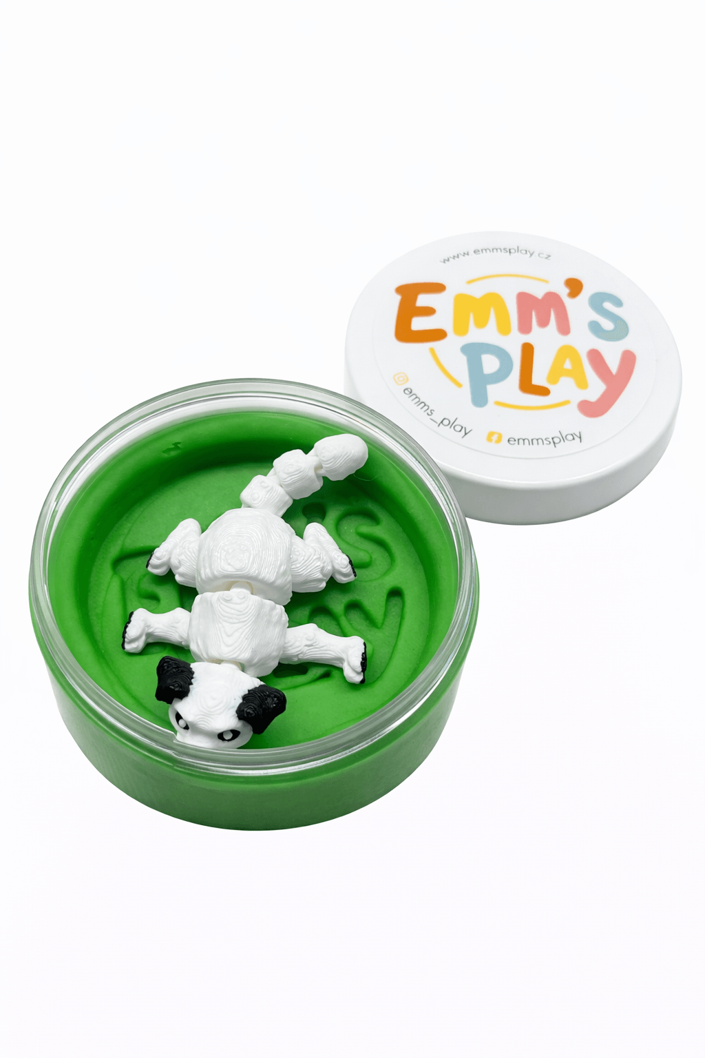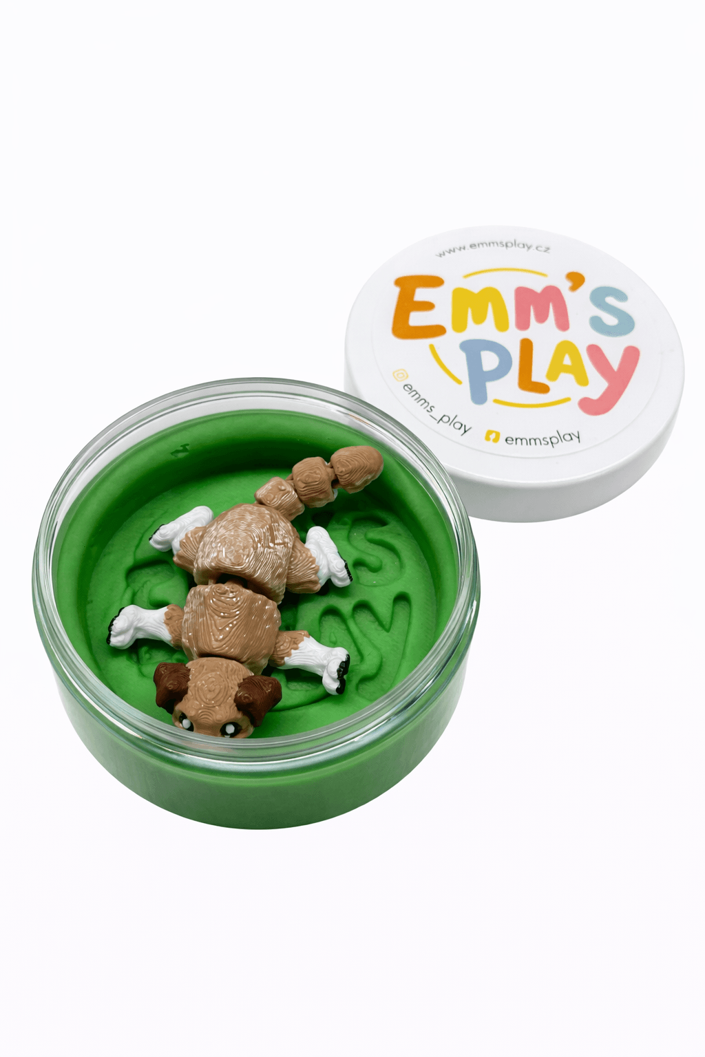 V dóze naleznete: 100g domácí modelíny, 1ks 3D pohyblivého pejska (bílý nebo béžový).