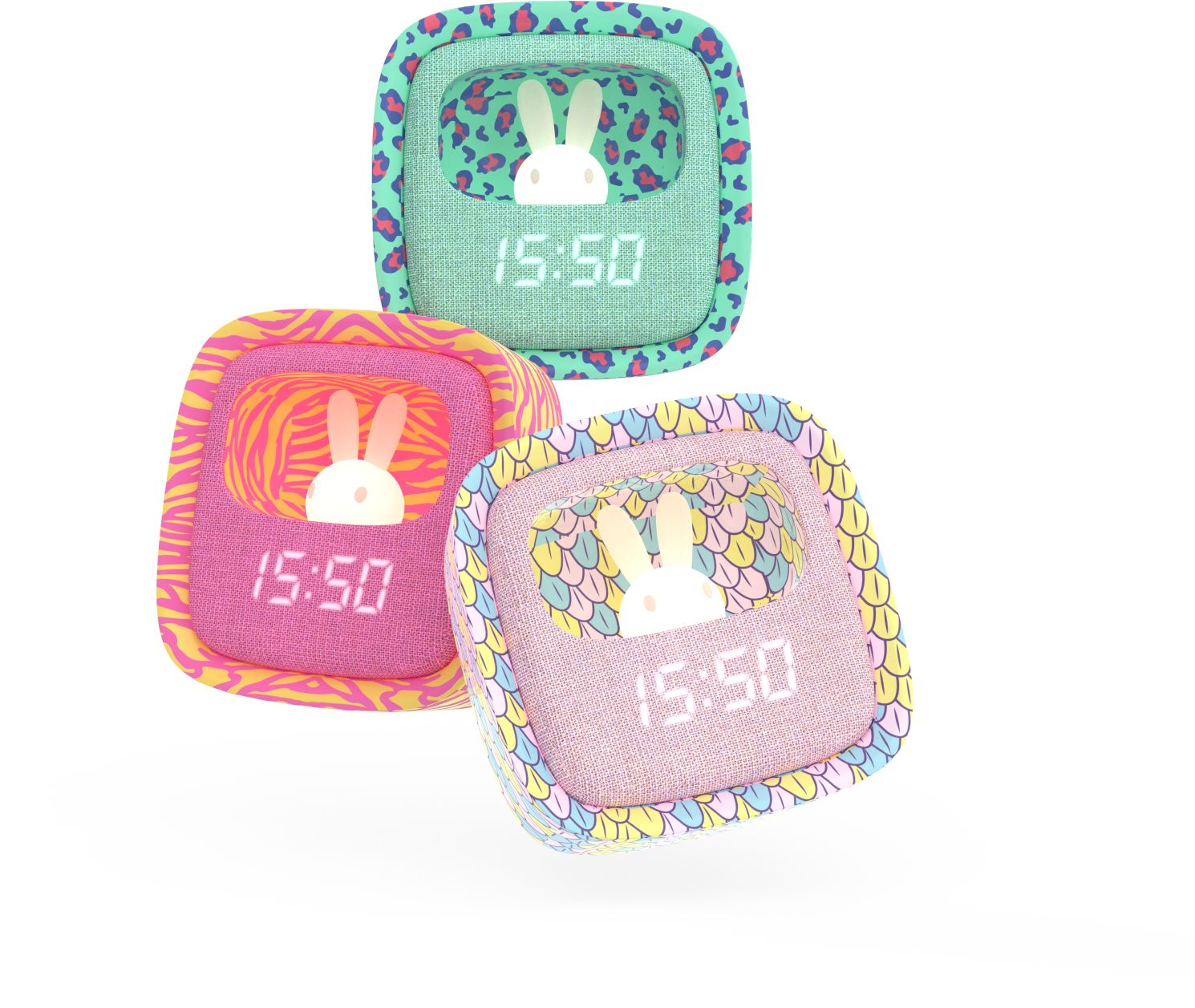 Přední část je pokrytá měkkým silikonem a látkou, což nejen zvyšuje estetický dojem, ale také přispívá k příjemnému doteku a bezpečnému používání i pro nejmenší děti. Ovládací tlačítka vzadu umožňují nastavit čas, datum a až tři různé alarmy, takže se vaše dítě probudí přesně včas bez stresu.