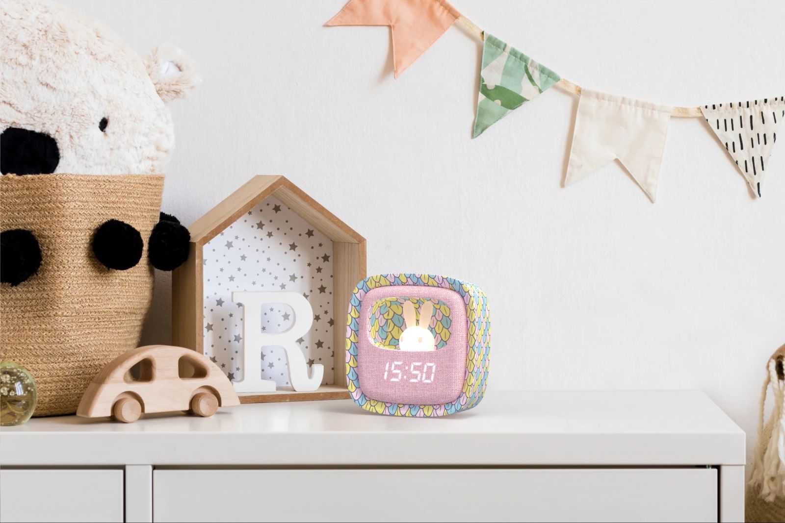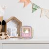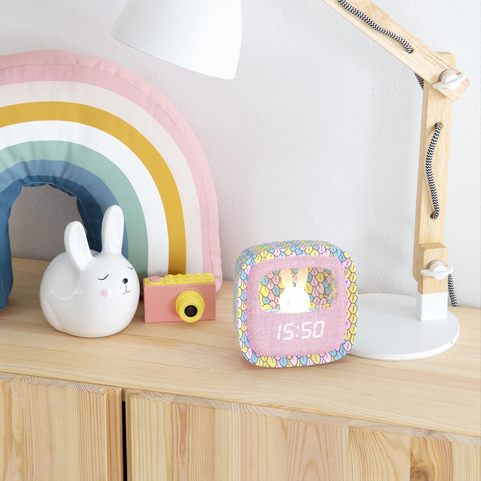 Přední část je pokrytá měkkým silikonem a látkou, což nejen zvyšuje estetický dojem, ale také přispívá k příjemnému doteku a bezpečnému používání i pro nejmenší děti. Ovládací tlačítka vzadu umožňují nastavit čas, datum a až tři různé alarmy, takže se vaše dítě probudí přesně včas bez stresu.