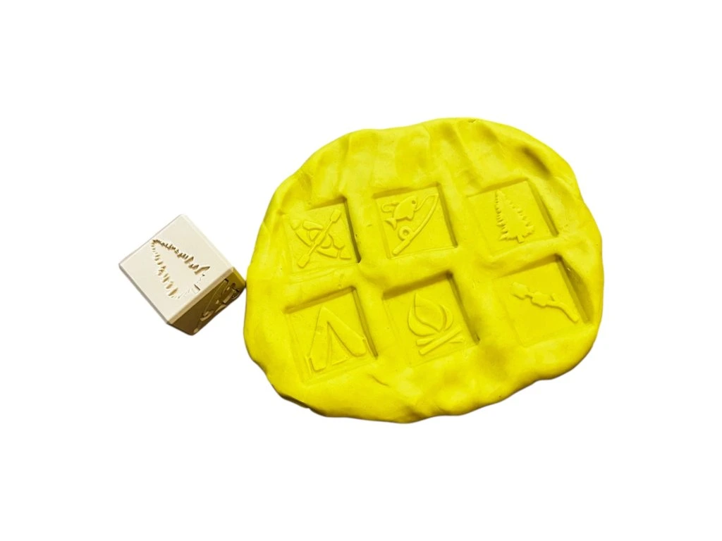 Obtiskovací kostka je lehká, ideálně velká a dobře se s ní pracuje. Vyzkoušet můžete použití různé síly při obtiskování do modelíny či hlíny. Pokaždé tak můžete vytvořit jiné scény a vzory na modelovací hmotě nebo v kinetickém písku.