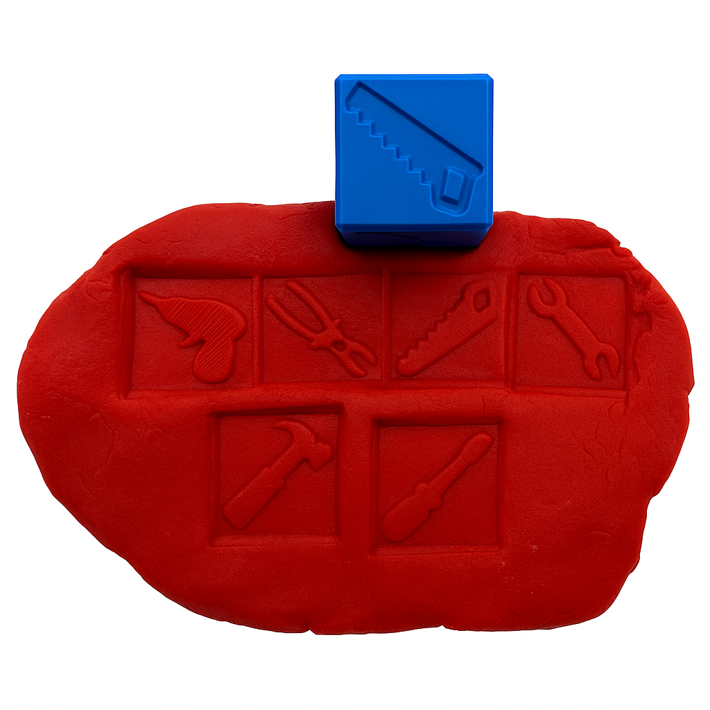 Obtiskovací kostka je lehká, ideálně velká a dobře se s ní pracuje. Vyzkoušet můžete použití různé síly při obtiskování do modelíny či hlíny. Pokaždé tak můžete vytvořit jiné scény a vzory na modelovací hmotě nebo v kinetickém písku.