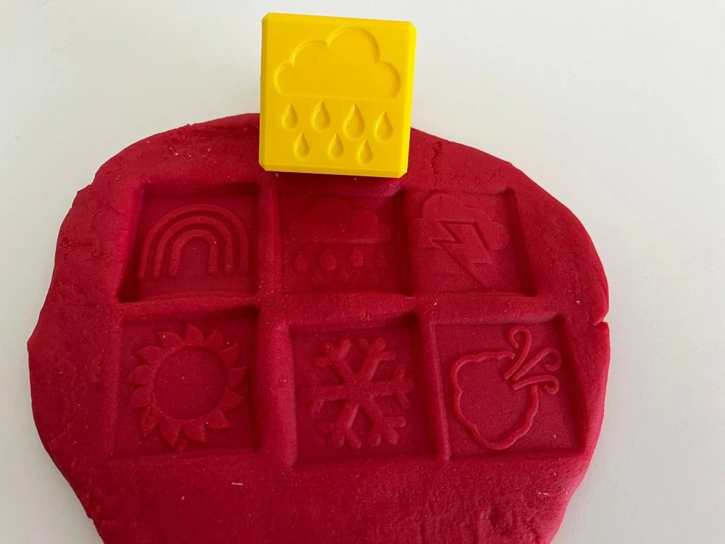 Obtiskovací kostka je lehká, ideálně velká a dobře se s ní pracuje. Vyzkoušet můžete použití různé síly při obtiskování do modelíny či hlíny. Pokaždé tak můžete vytvořit jiné scény a vzory na modelovací hmotě nebo v kinetickém písku.