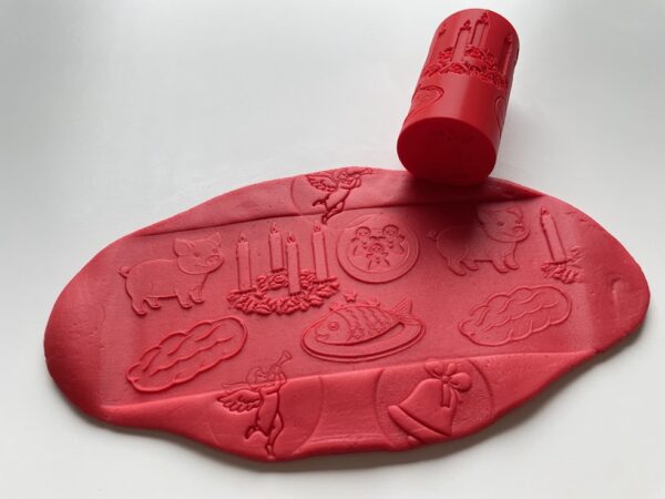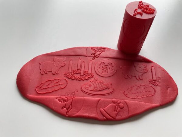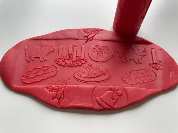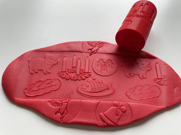Ideální je, doplnit obtiskovací váleček jednobarevnou modelínou. Naše ručně vyráběná modelína je měkká, jemná, pružná a nelepivá s jemnou vůní. Ideální na krájení, vykrajování, obtiskování, stříhání, modelování …