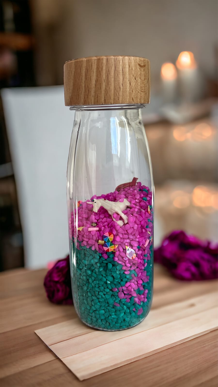 Senzorické zvukové lahvičky Petit Boum jsou barevným světem obsaženým v malé formě vhodné pro děti. Baví, vzdělávají a podněcují fantazii! Nechte své dítě pohybovat, třást a manipulovat s lahví, aby prozkoumalo barvy a tematické figurky uvnitř. Různorodý obsah lahví umožňuje objevování nových, zajímavých zvuků charakteristických pro prvky skryté uvnitř. Hra s lahví Petit Boum rozvíjí smysly a představivost dítěte! Poznáte lahve podle zvuků? Najdete uvnitř jednorožce? 🙂