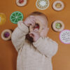 Senzorické chrastítko z této kolekce je perfektní volbou pro nejmenší od 6 měsíců. Vyrobeno z vysoce kvalitního bukového dřeva, má kulatý tvar připomínající koblihu s chrastící náplní uvnitř. Malé korálky a barevné prvky ve tvaru ovoce a zeleniny se pohybují a vytvářejí jemné zvuky, které stimulují dětské smysly. Přírodní dřevo je bezpečné a snadno se uchopí.
