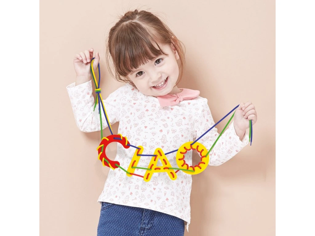 Sada písmen a čísel a provlékací šňůrky.