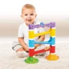 Barevná věž, po které se kutálejí 3 velké zvukové kuličky – při jízdě jemně chrastí/rachtají a promění sledování v smyslovou podívanou. Děti posílají kuličky ručně z vršku dráhy, sledují, co se stane, a objevují princip příčina → následek. Skvělá první kuličkodráha pro batolata: posiluje jemnou motoriku, koordinaci oko–ruka i soustředění. Vhodné od 18 měsíců.