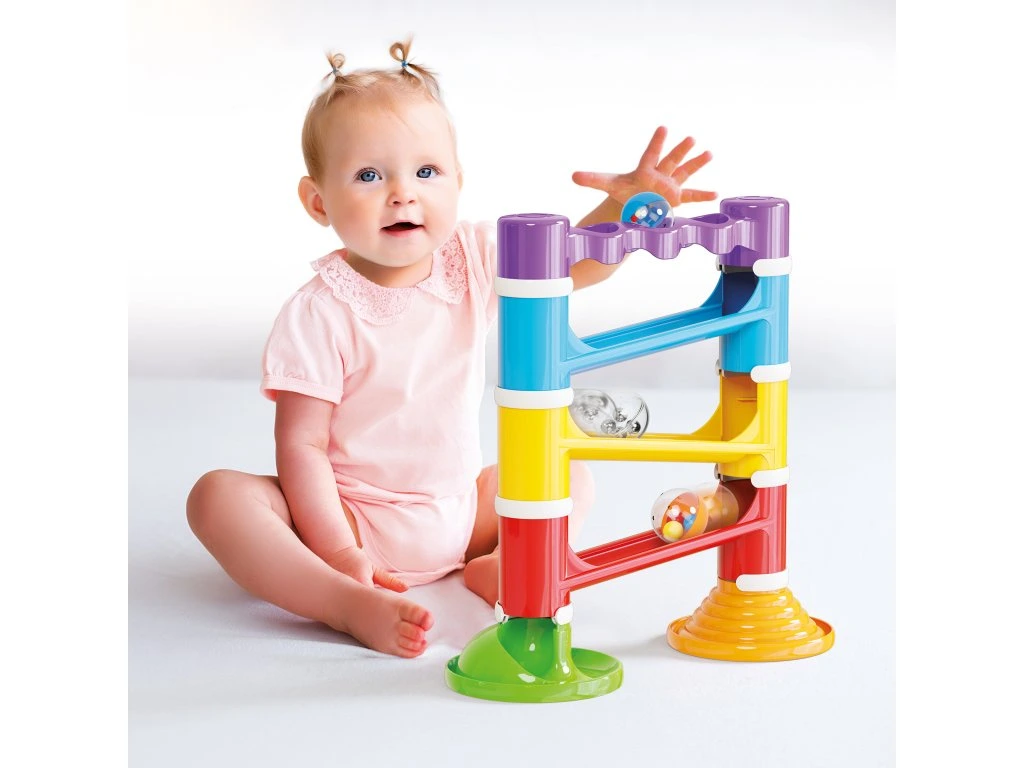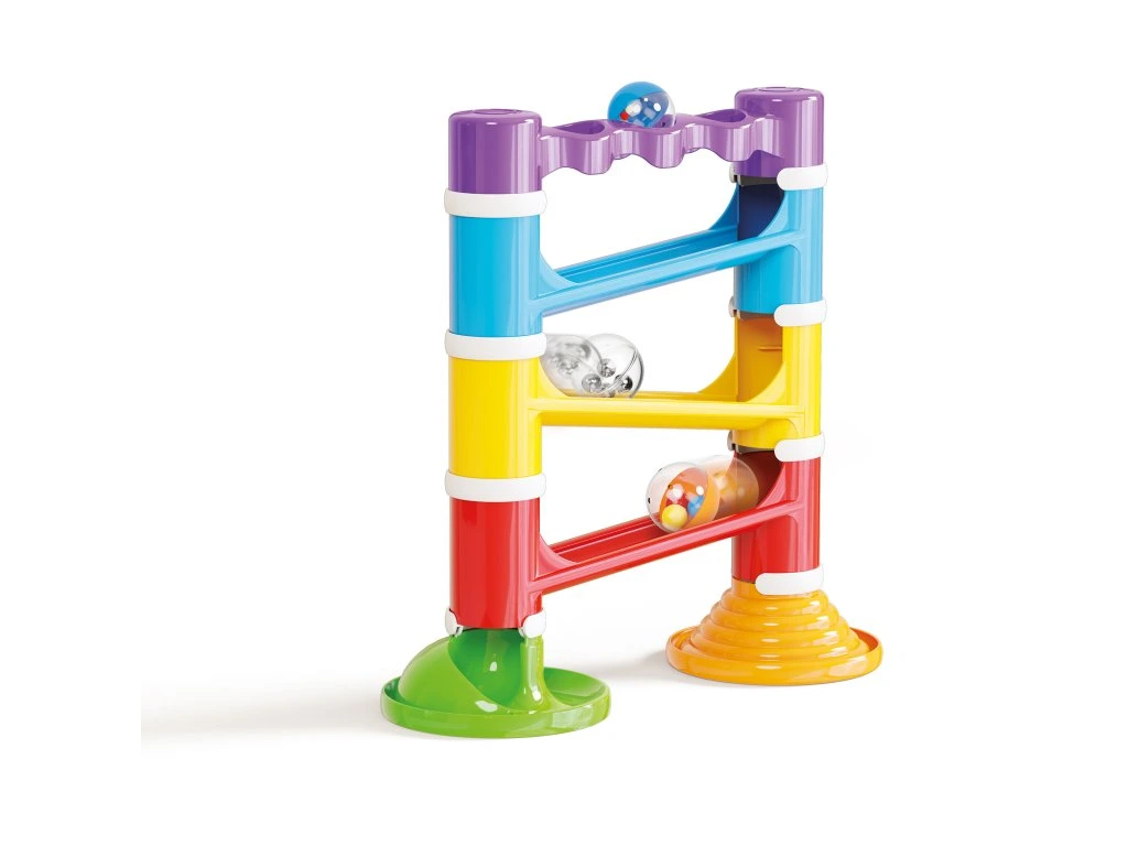 Barevná věž, po které se kutálejí 3 velké zvukové kuličky – při jízdě jemně chrastí/rachtají a promění sledování v smyslovou podívanou. Děti posílají kuličky ručně z vršku dráhy, sledují, co se stane, a objevují princip příčina → následek. Skvělá první kuličkodráha pro batolata: posiluje jemnou motoriku, koordinaci oko–ruka i soustředění. Vhodné od 18 měsíců.