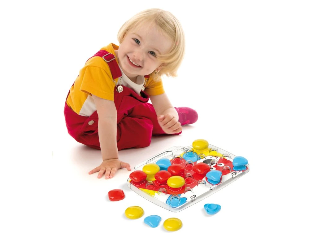 Quercetti FantaColor Baby je mozaiková hračka navržená speciálně pro nejmenší děti — ideální už od cca 18 měsíců. Balení obsahuje velké, dobře uchopitelné barevné kolíčky (Ø cca 46 mm), které děti vkládají do perforované plastové desky podle přiložených předloh. Hra podporuje rozvoj jemné motoriky, koordinace ruka–oko a zároveň pomáhá dětem rozlišovat barvy, tvary a procvičovat první logické schopnosti. Součástí sady je také kufřík s držadlem, díky kterému je hra snadno přenosná a ukliditelná — výborné pro hraní doma i na cesty. Hotové mozaiky lze skládat podle vzorových karet, ale děti mohou také volně experimentovat a vytvářet vlastní barevné obrazce, což podporuje jejich kreativitu a fantazii.