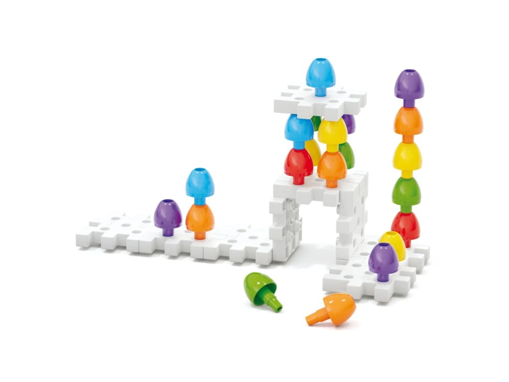 Sada Jumbo Peggy je hravá mozaika s velkými barevnými kolíčky a podložkami — ideální pro malé děti již od zhruba 2–3 let. Děti vkládají plastové kolíčky do perforovaných desek podle jednoduchých předloh a vytvářejí první barevné mozaikové obrázky. Díky velkým a dobře uchopitelným kolíčkům si malí umělci snadno poradí i s jemnou motorikou a koordinací oko-ruka. Pokud předlohy odložíte, hra se promění ve stavebnici — děti mohou kolíčky stohovat a stavět věže či jiné konstrukce podle vlastní fantazie. Sada podporuje kreativitu, prostorové vnímání, soustředění a manuální zručnost.