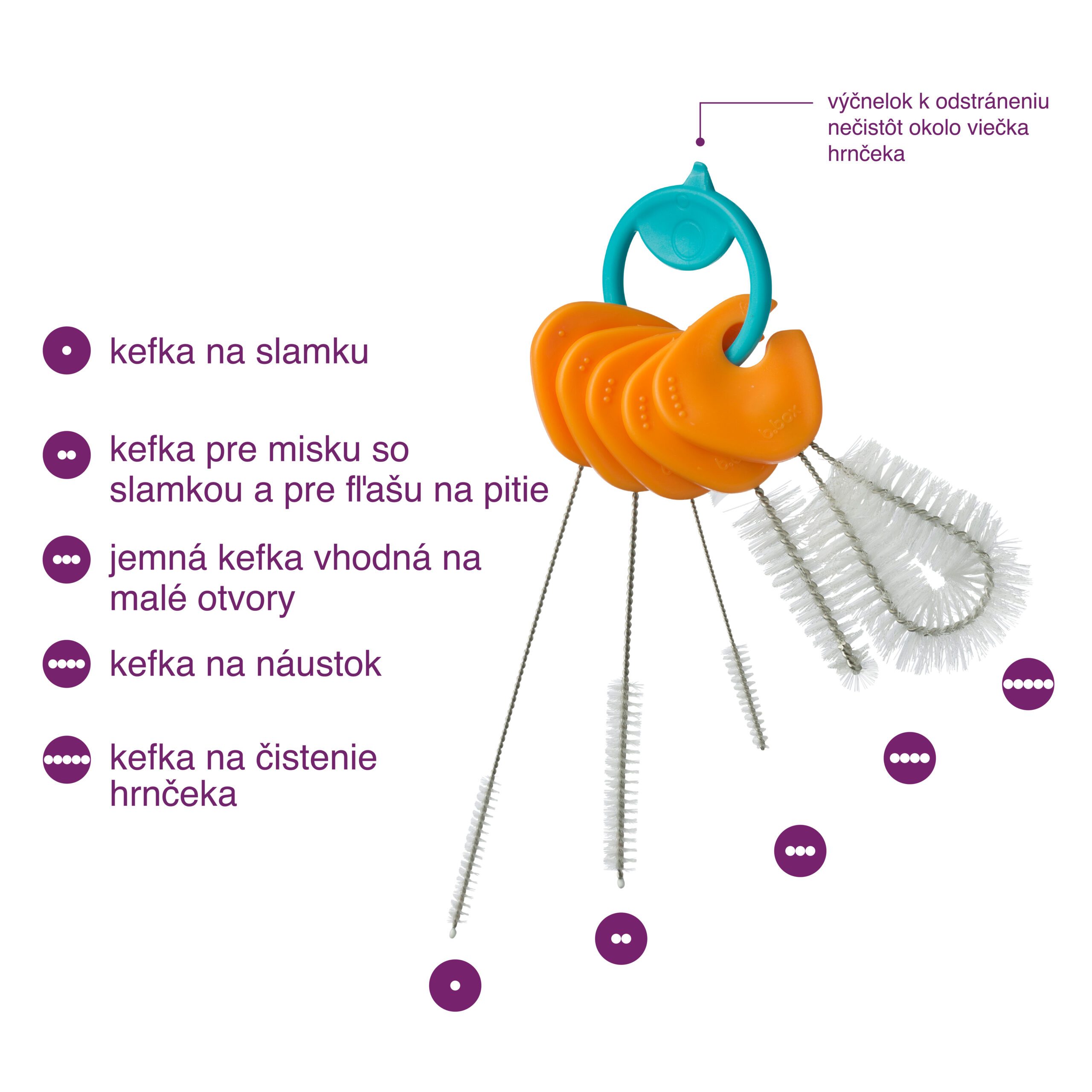 Praktická sada kartáčků od australské značky b.box obsahuje vše, co potřebujete k důkladnému vyčištění hrnečků s brčkem, lahví i termosek na pití. Kartáčky jsou navlečené na kroužku pro snadné uskladnění, ale dají se jednoduše sejmout a po použití opět připevnit zpět.
