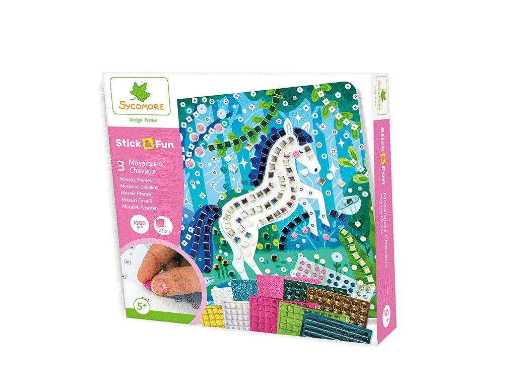 Objevte kouzlo mozaikového tvoření s touto kreativní sadou, která dětem od 5 let přináší spoustu zábavy a zároveň podporuje jemnou motoriku, koordinaci oko–ruka i vnímání barev a tvarů. Pomocí samolepicích kamínků a třpytivých mozaikových dílků si děti dotvoří tři krásné obrázky s motivem koníků. Každý nalepený detail dodá jejich výtvoru jedinečný lesk a promění obrázek v nádhernou dekoraci. Po dokončení si mohou na hotové dílko snadno připevnit průhledný závěs a hrdě jej vystavit v dětském pokoji. Kreativní tvoření tak spojuje zábavu, estetiku a rozvoj důležitých dovedností v jednom.