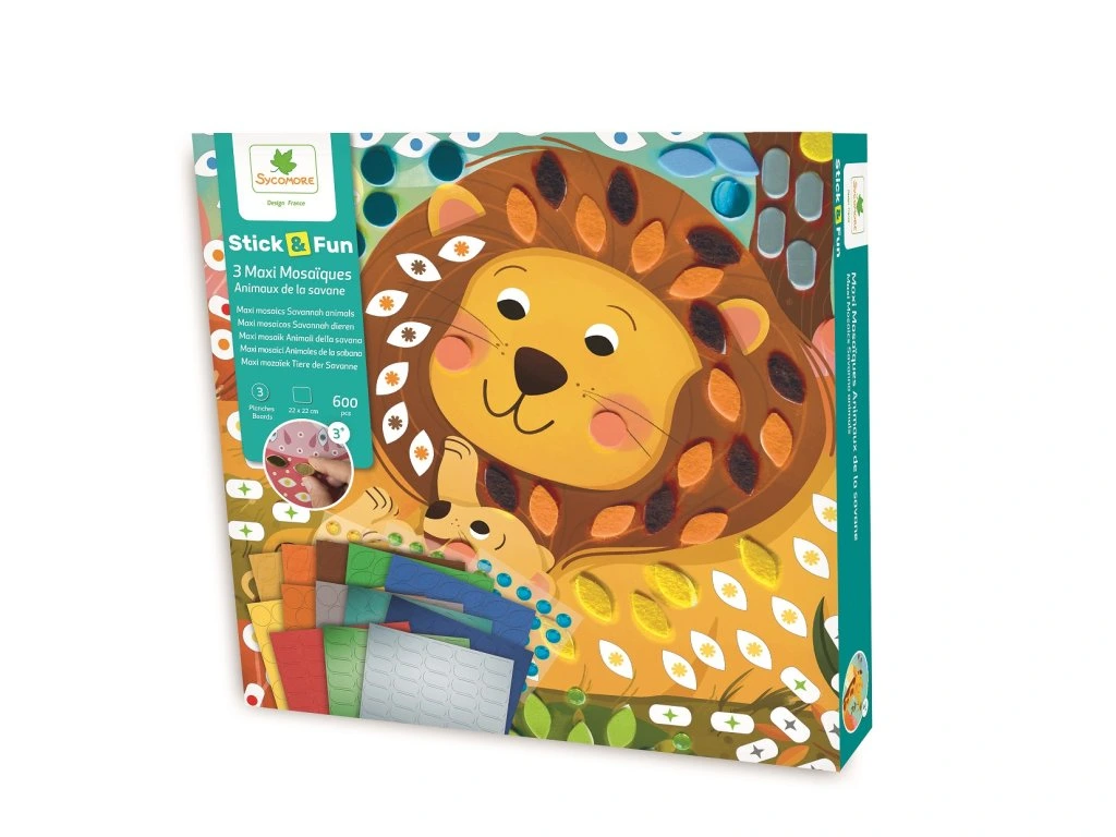 Objevte kouzlo mozaiky! Tato kreativní sada je ideální pro děti od 3 let a nabízí nejen spoustu zábavy, ale také rozvoj jemné motoriky, koordinace oko–ruka i vnímání barev a tvarů. Děti si dotvoří tři roztomilé obrázky zvířátek pomocí třpytivých mozaikových dílků a samolepicích kamínků. Hotové obrázky si mohou vystavit – stačí je zavěsit na průhledné závěsy, které jsou součástí balení.