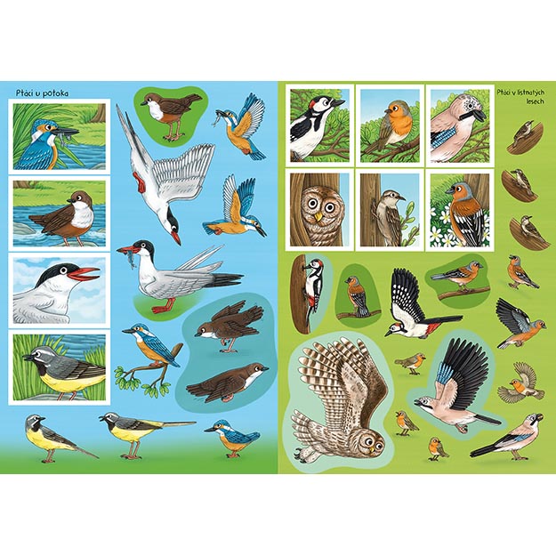 - Dotvoří ptačí scény, naučí se poznávat různé druhy a vytvářet vlastní „atlas“ pomocí samolepek.