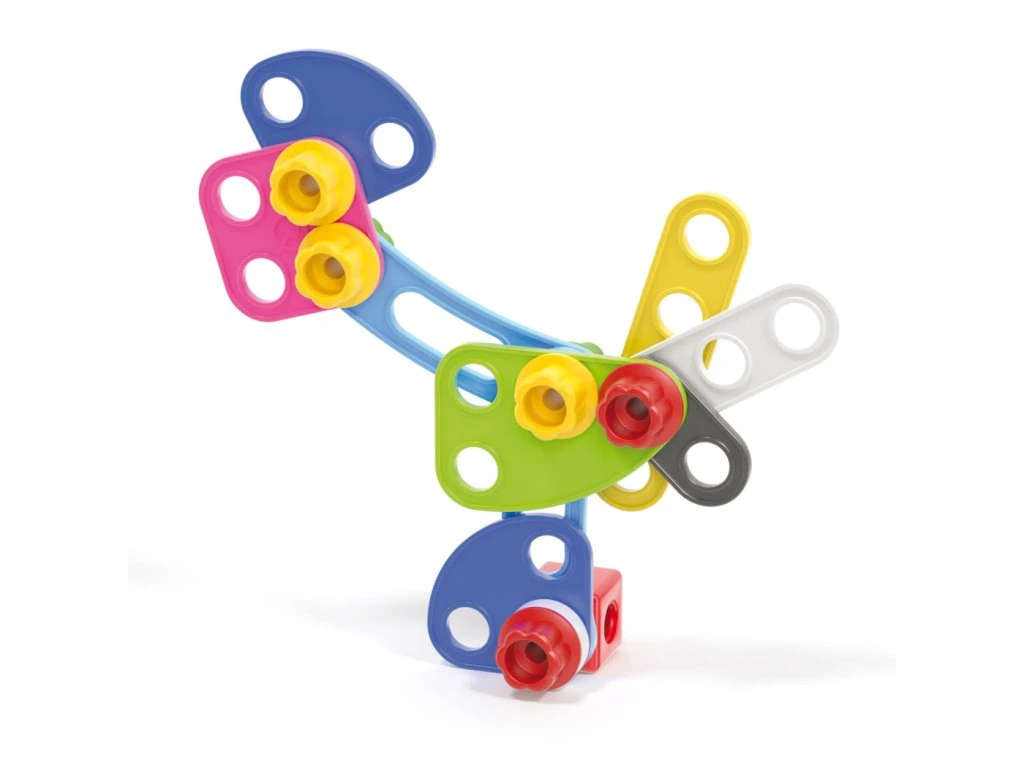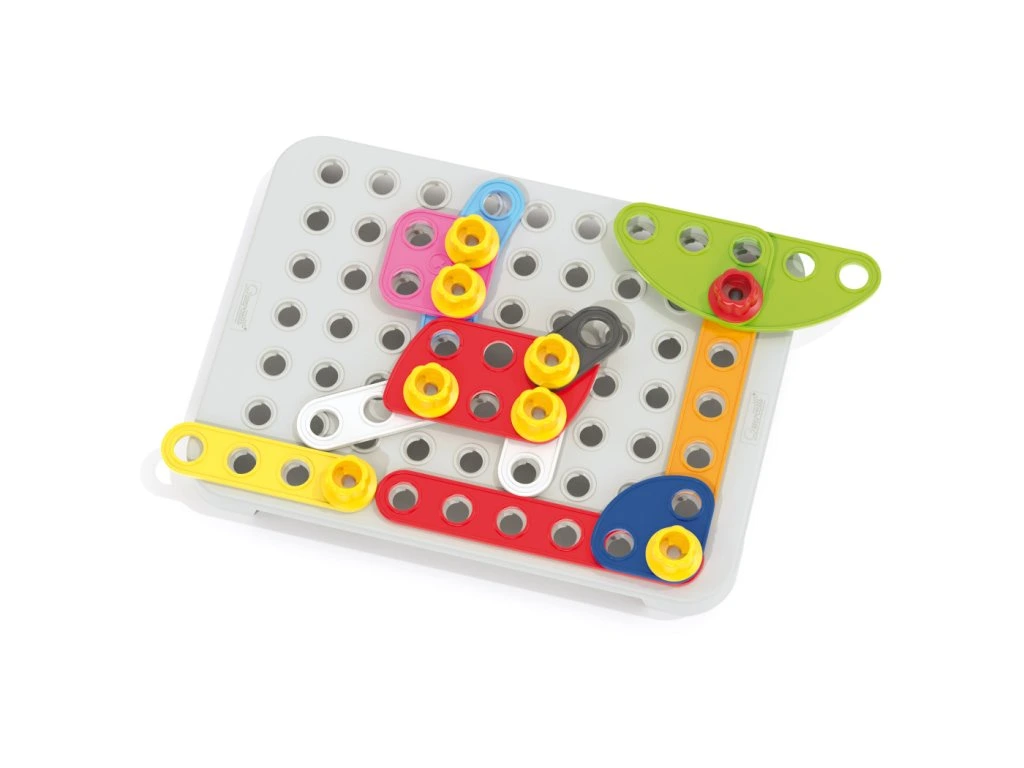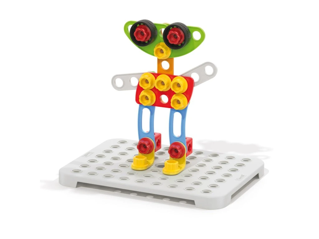 První „opravdová“ technická stavebnice pro malé konstruktéry. Velké šrouby, matice (včetně křídlových), kola a perforované dílky z odolného, netříštivého plastu se montují bez nářadí – jen rukama. Děti tak hravě pochopí příčinu → následek i základní principy mechaniky, a přitom trénují jemnou motoriku a soustředění. Součástí je perforovaná podložka pro stavění horizontálně i vertikálně. Vyrobeno v Itálii.