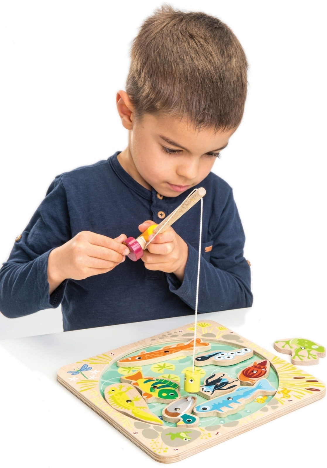 Připravte se na dobrodružství “rybaření” s touto krásně zpracovanou sadou Pond Dipping, která obsahuje plně zarybněný rybník, vysouvací rybářský prut s magnetickou koncovkou a osm dřevěných magnetických zvířátek, jež děti mohou pomocí prutu chytat.