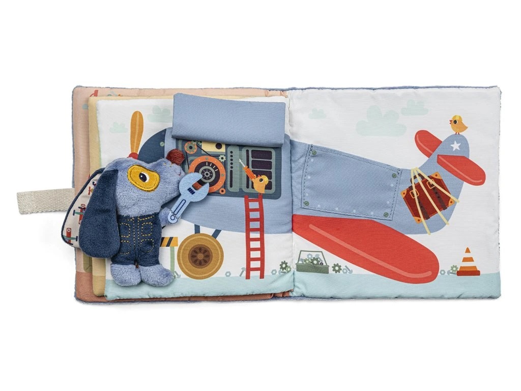 Co se děje v Julesově garáži? Otevřete dvířka, zvedněte klapky a sledujte, co se skrývá pod kapotou traktoru nebo kdo potřebuje opravit letadlo. Děti provází příběhem malý pejsek Jules – měkká postavička, kterou posouvají stránku po stránce. Knížka pro nejmenší od 12 měsíců přirozeně rozvíjí zrak, sluch, jemnou motoriku, fantazii i logické uvažování; obálka navíc láká šustivým efektem. Vyrobena je z recyklovaného polyesteru a lze ji prát na 30 °C (jemný cyklus). Rozměr 16 × 4,5 × 16 cm.
