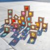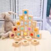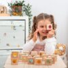 - 20 bukových kostek s kaleidoskopickými čočkami – podněcují vizuální sledování a rozpoznávání barev