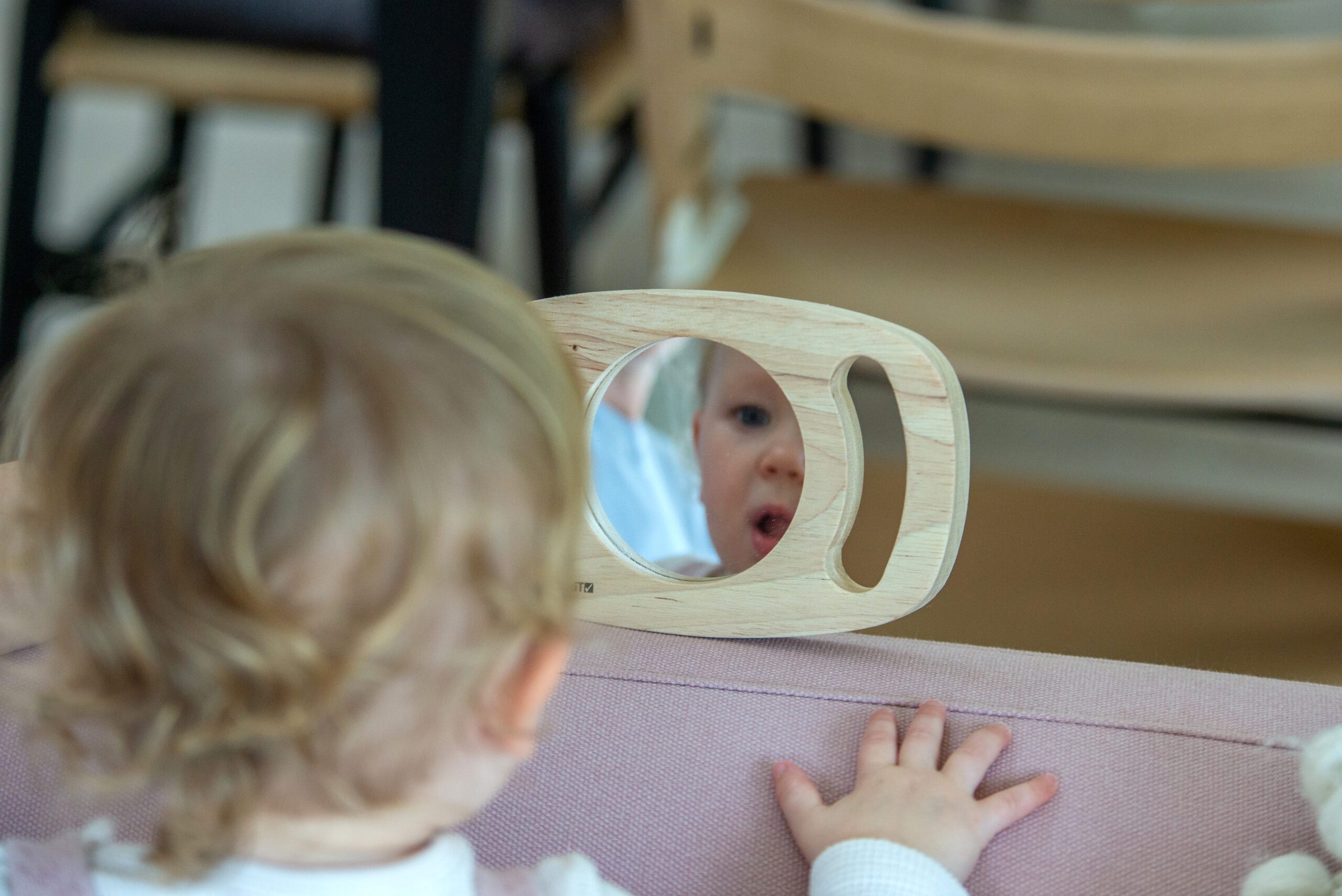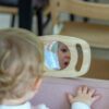 Ruční akrylové zrcadlo pro sebereflexi, pro skupinové hry a hraní rolí. Je umístěno v masivním rámu z kaučukového dřeva, je extrémně pevné a snadno se drží a manipuluje s ním.