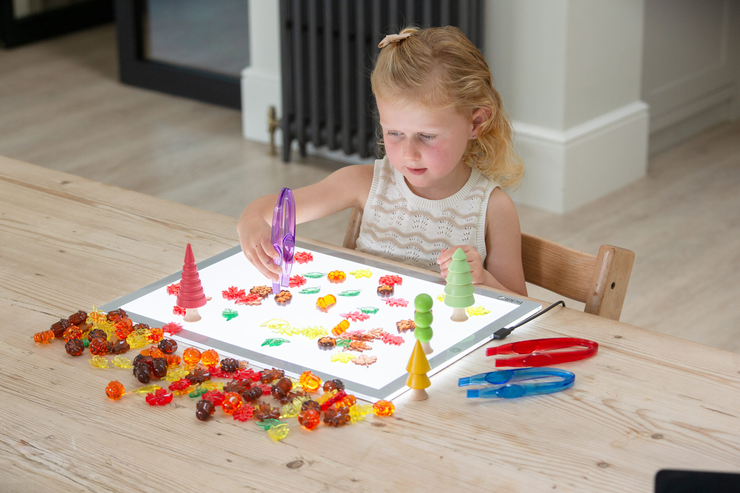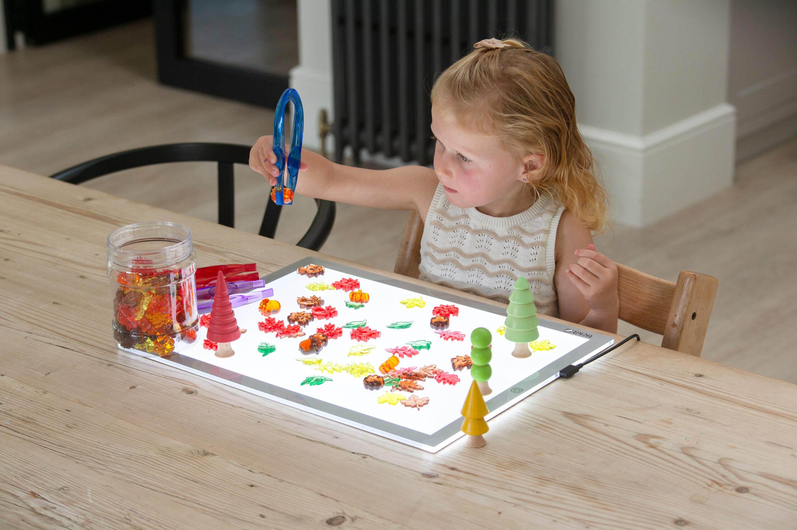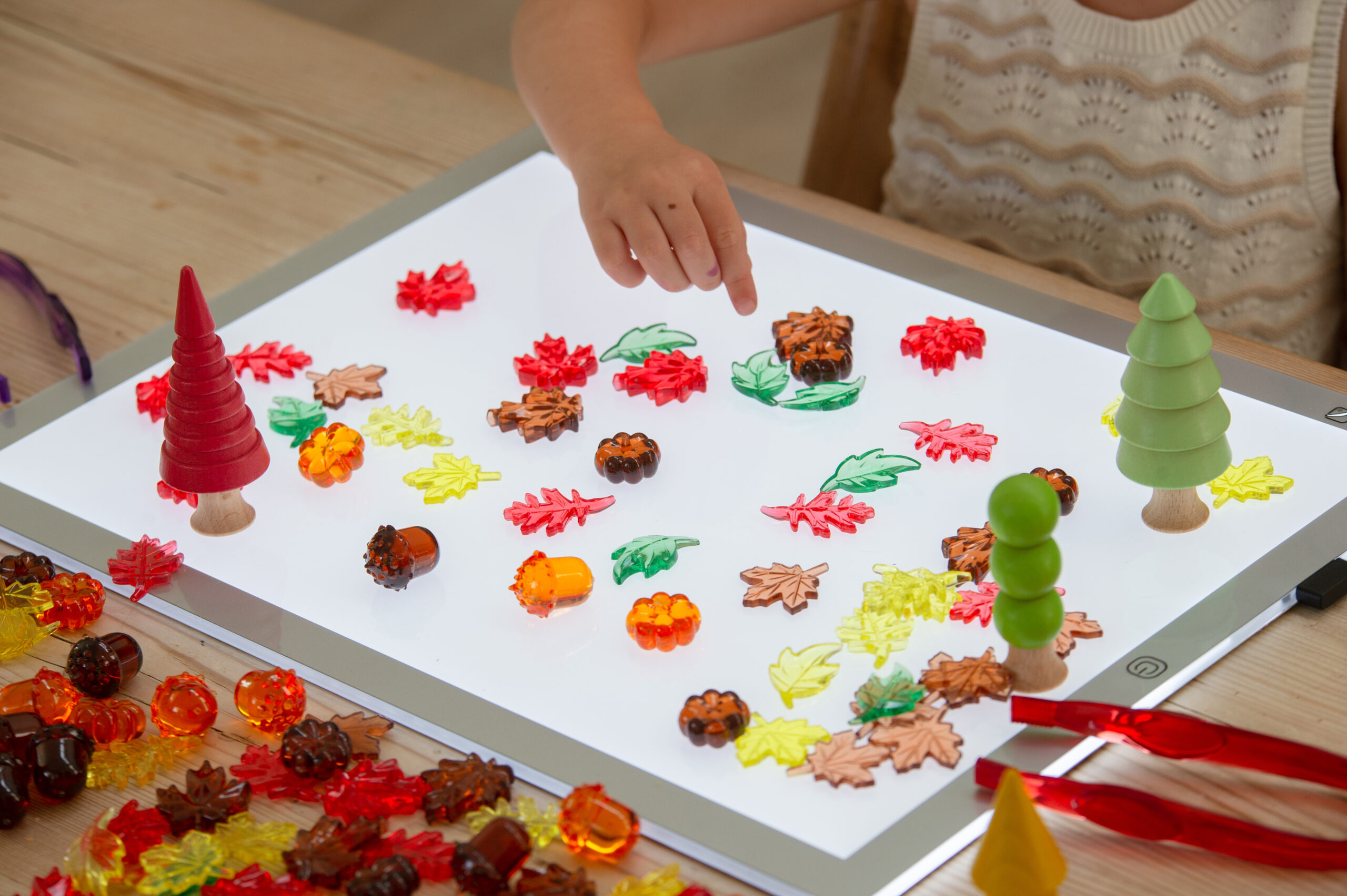 Průsvitné, jasné barvy (červená, oranžová, žlutá, zelená a hnědá) se nádherně rozsvítí na světelném panelu, což zvyšuje vizuální atraktivitu a dělá učení ještě zábavnějším. Každý tvar je detailně propracovaný — od žaludů přes dýni až po různé typy listů — a vybízí děti k prozkoumávání dotykem i pohledem.