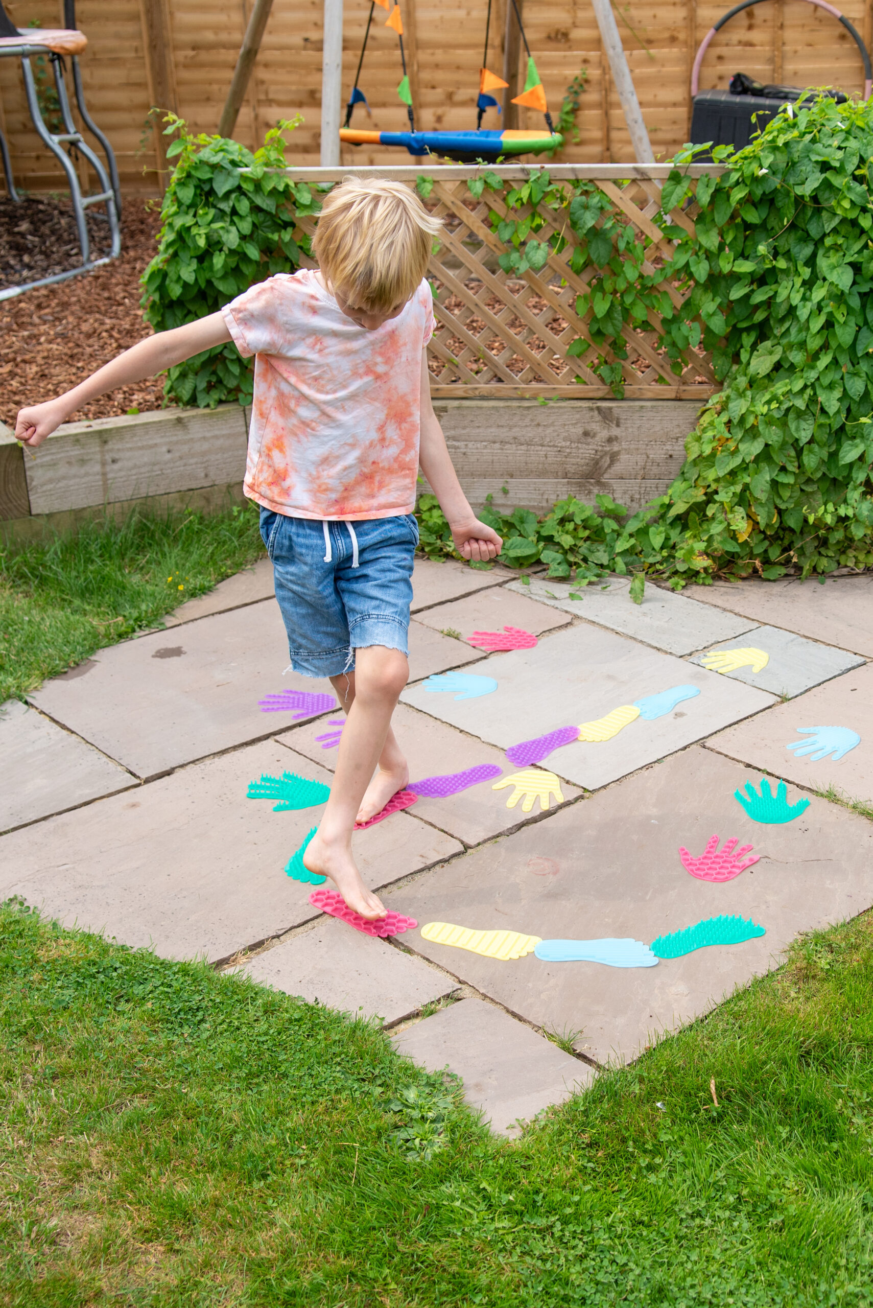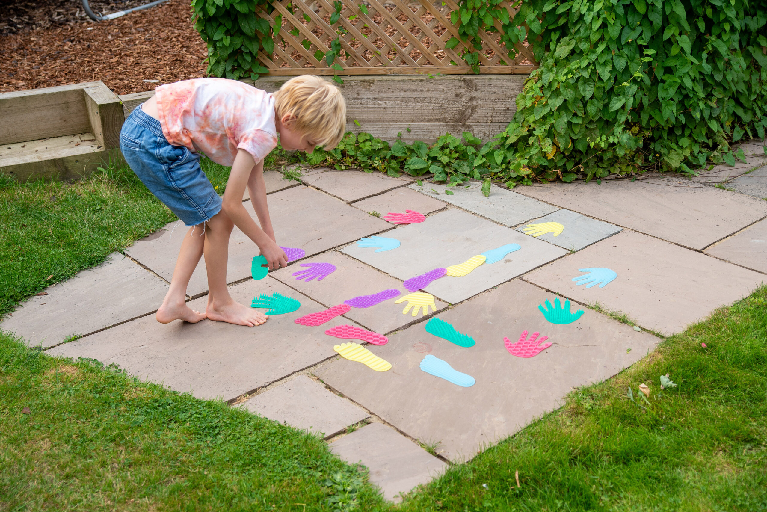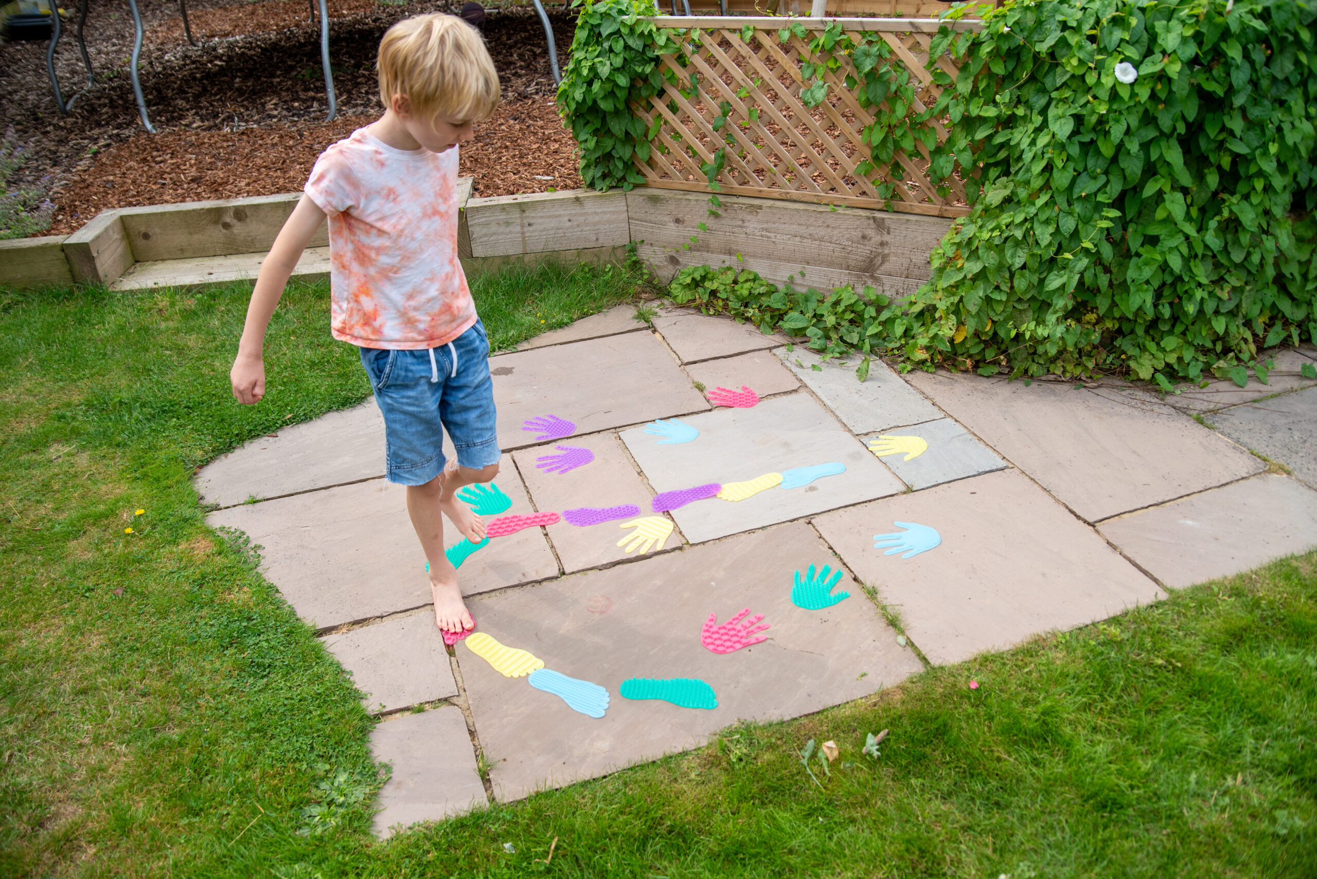 Produkt podporuje rozvoj hrubé i jemné motoriky, koordinace pohybů, rovnováhy a prostorové orientace. Díky různým texturám rozvíjí hmatové vnímání a smyslovou integraci. Děti se učí rozlišovat povrchy, barvy a tvary, což přispívá také k rozvoji slovní zásoby. Sada je vhodná pro pohybové hry, smyslové dráhy i aktivity zaměřené na uvědomění si vlastního těla.
