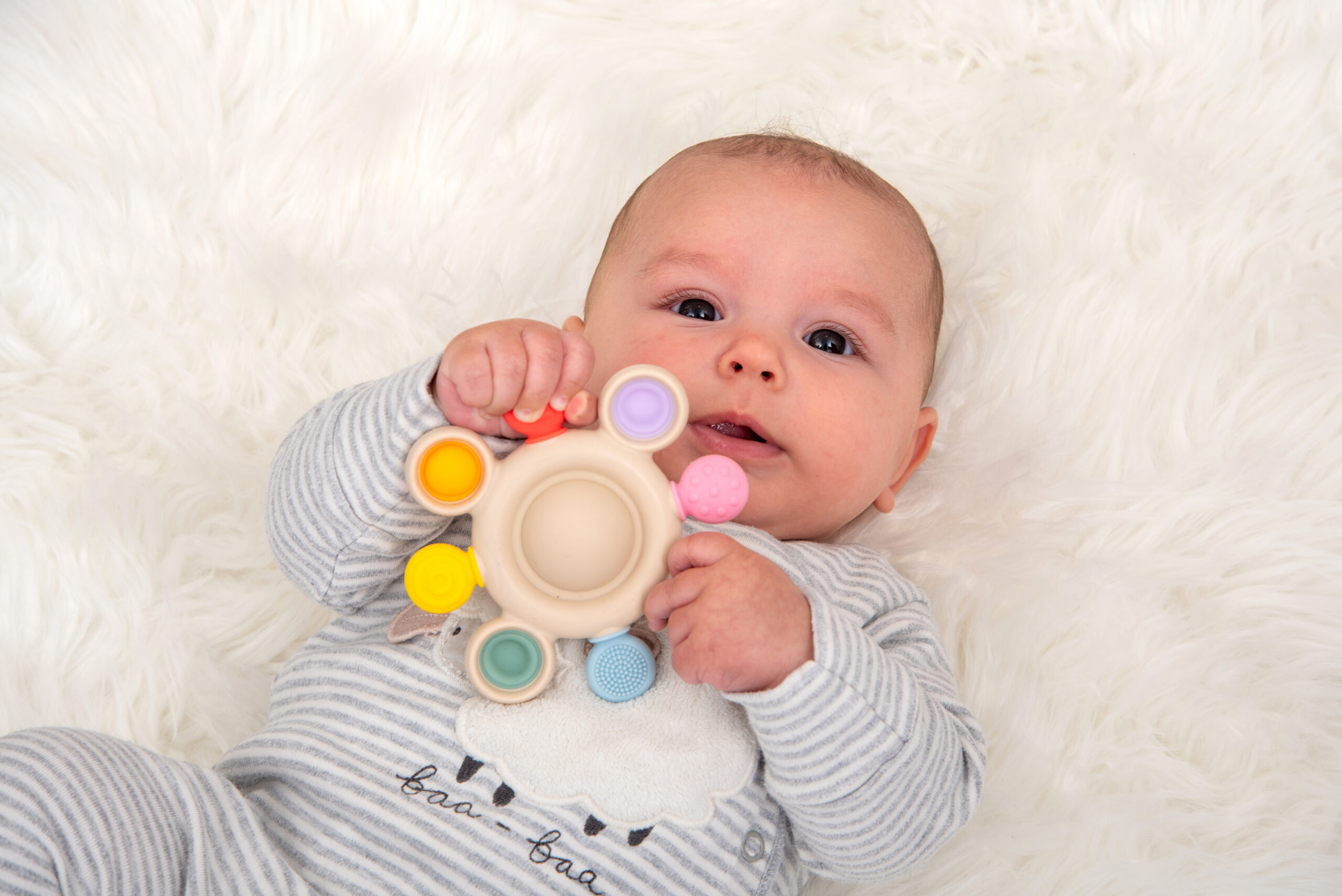 Barevná pop tlačítka poskytují příjemný klikavý efekt při mačkání a podporují objevování příčiny a následku a rozvoj jemné motoriky. Okolo nich jsou různé texturované kousací prvky, které nabízejí úlevu od bolesti dásní a stimulují hmatové vnímání. V centru hračky se nachází jemné chrastítko, které při otřesu upoutá pozornost dítěte a přináší zvukový stimul pro rozvoj sluchu.