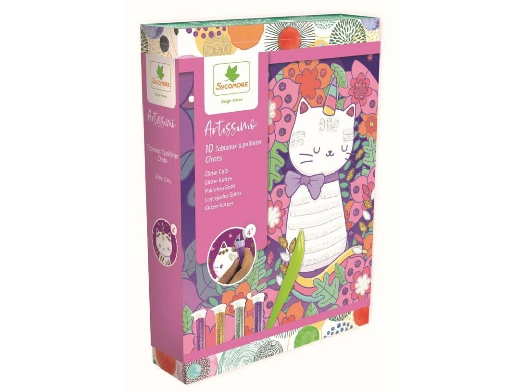 Obsah balení: 10 obrázků, 4 tuby se třpytkami, špachtle a barevný návod.