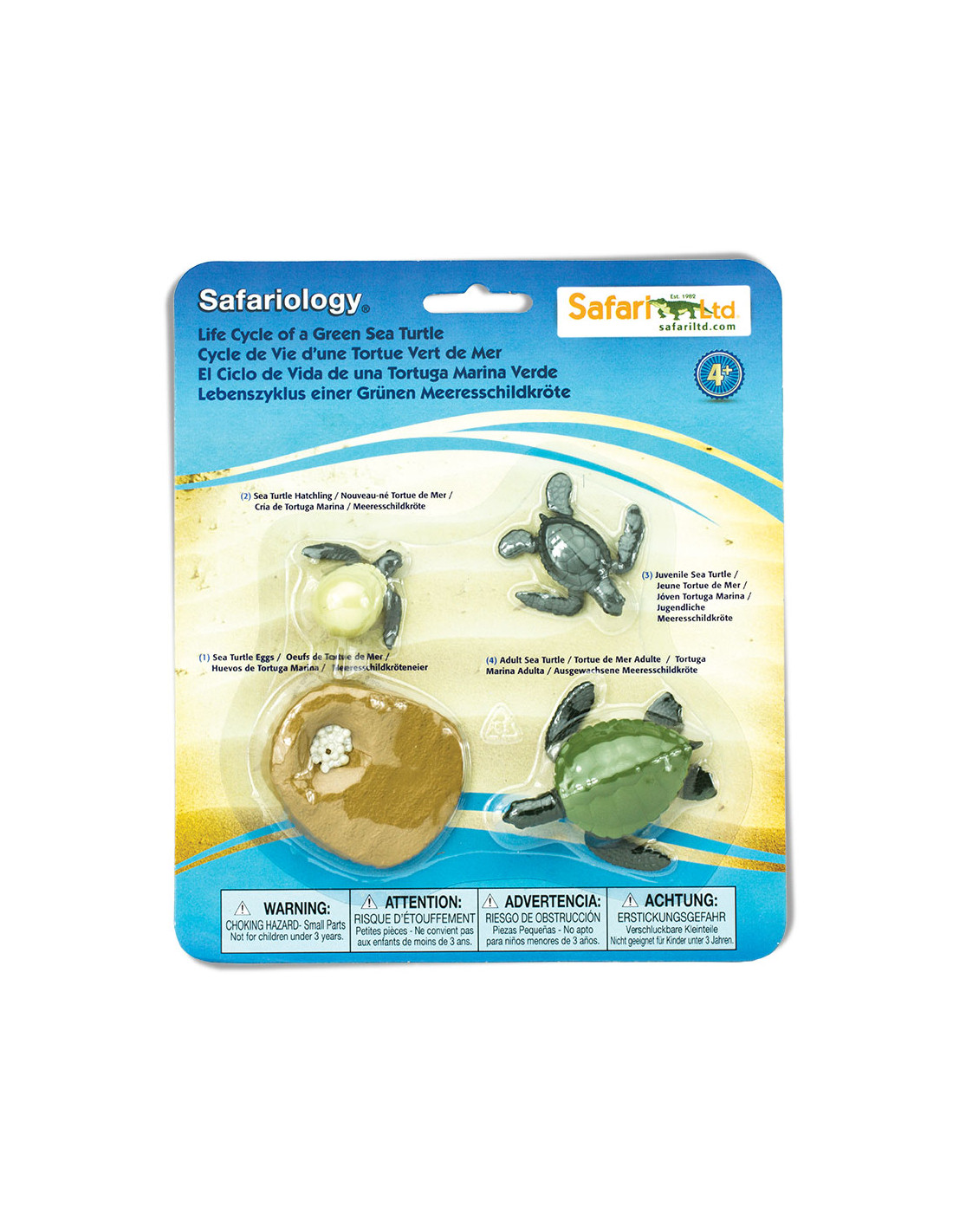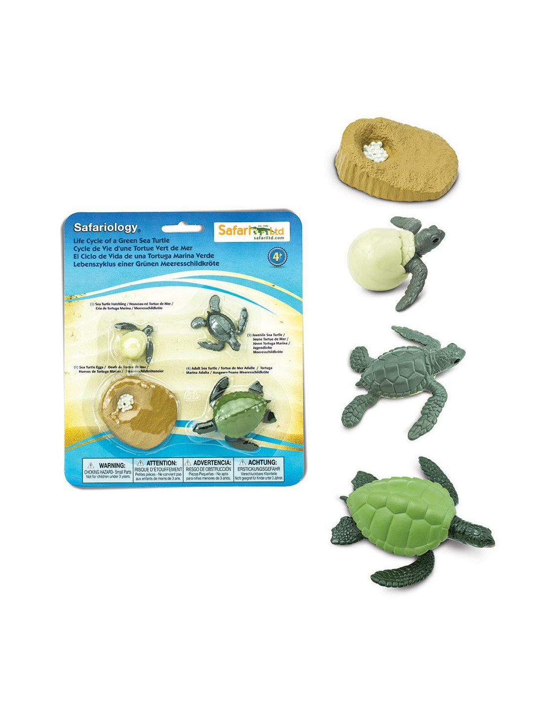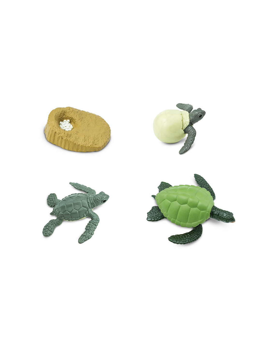 Soubor replik pět stádii životního cyklu mořské želvy, vyrobený s péčí a důrazem na věrnost a přesnost detailů, vás provede proměnou od vajíček, přes líhnoucí se želvu, mládě želvy a až po dospělého jedince.